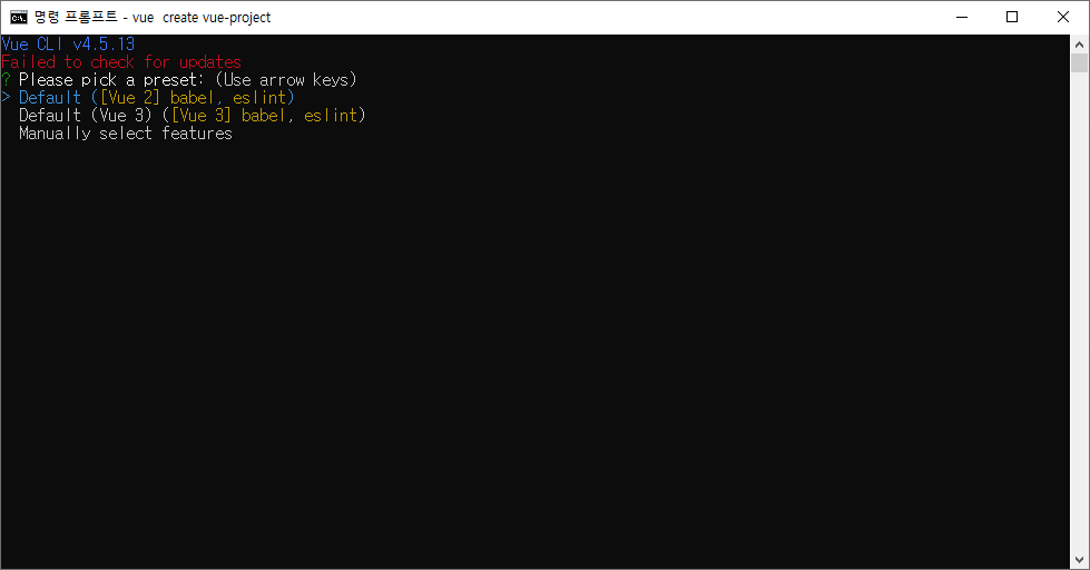 기본 값인 [vue2] babel, eslint 로 선택한다(필요에 따라서 선택하면 된다.)