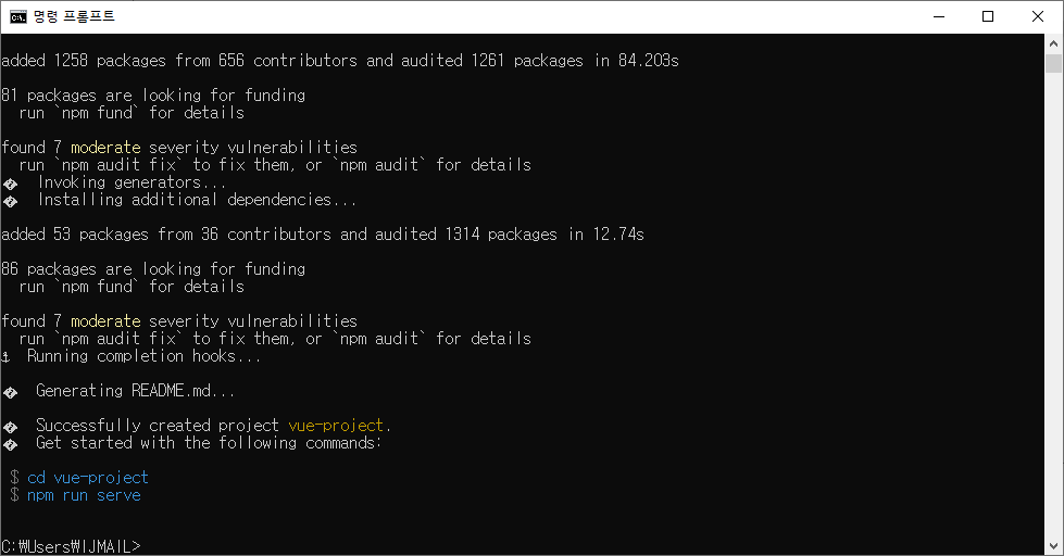 SuccessFully create project vue-project. 문구를 확인후 아래 명령어를 입력해준다.